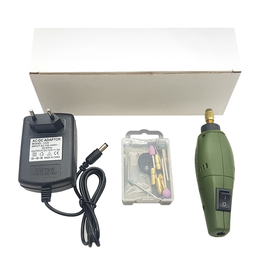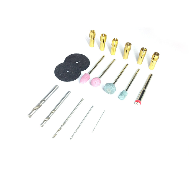 5 عدد کولت (0.5 میلی متر ، 1.0 میلی متر ، 1.5 میلی متر ، 2.4 میلی متر ، 3.2 میلی متر)،5 عدد مته و دو عدد سمباده